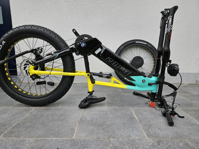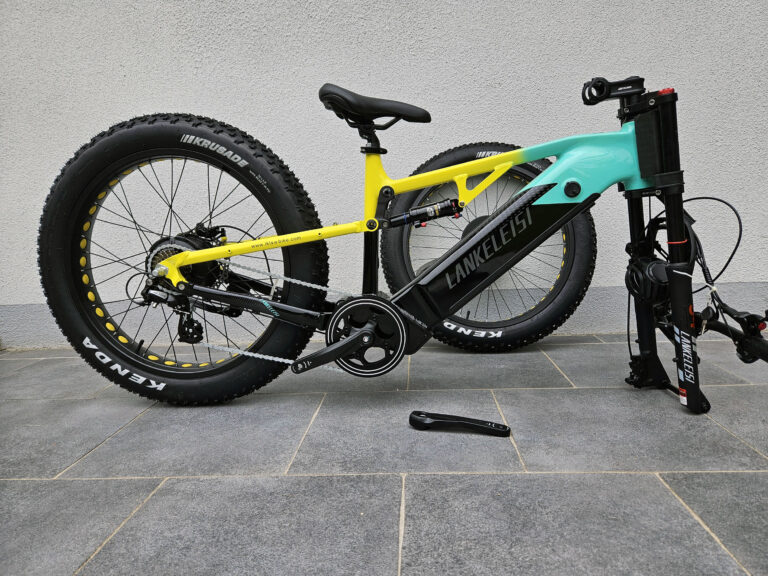 Le Lankeleisi RV800 Plus est un fat bike avec un cadre triangulaire penché vers l’arrière et donc avec une position haute pour le guidon. Cette configuration est sans doute conçue pour faire de la piste et rouler debout sur le vélo.
