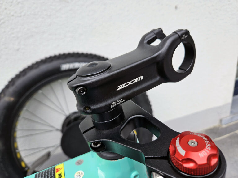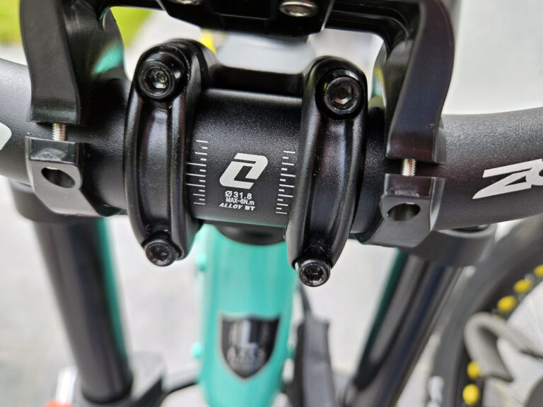 Vous ne pourrez d’ailleurs jamais atteindre un axe parfaitement horizontal parce que la hauteur de selle ne permet pas de revenir à l’équilibre, elle est ici au maximum. Ajoutez à ça que la suspension arrière va s’abaisser avec votre poids, la différence entre l’avant et l’arrière va donc s’accentuer. Ce n’est pas un problème en soi, il faut juste comprendre pourquoi ce vélo a été conçu.