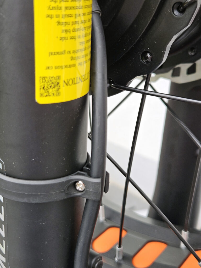 Après avoir inséré la roue vous devez connecter le moteur, les deux câbles sont également marqués d'une flèche, il faut les faire correspondre. Vous devez ensuite dévisser l'attache câble sur la fourche pour y insérer le câble d'alimentation et ensuite resserrer le tout pour que le câble ne bouge plus.