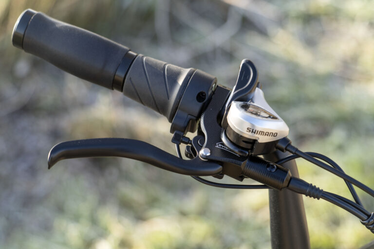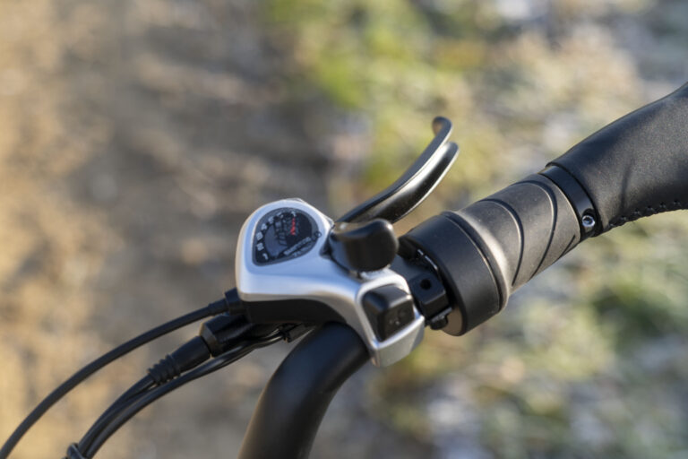 Sur la partie droite du guidon, il y a le levier qui permet de changer de vitesse au niveau du dérailleur ainsi qu'un bouton permettant d'accéder aux vitesses 5 à 7 qui ne sont pas accessibles avec le levier. La poignée de droite est également découpée en deux parties, une avec l’accélérateur et l'autre avec la poignée normale. Ici aussi il faut s’habituer à la présence de l'accélérateur et éviter de l'activer par accident.