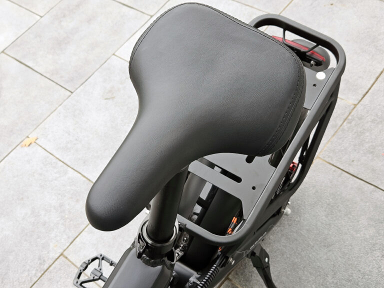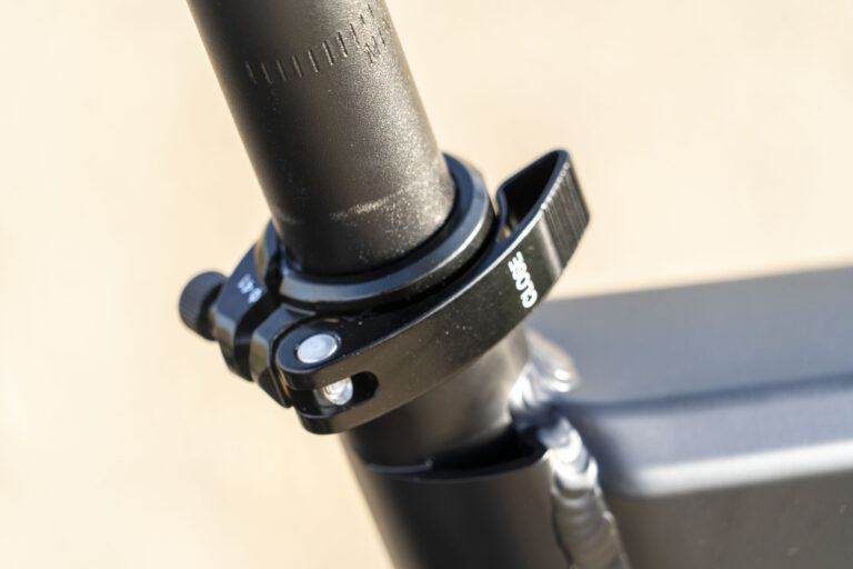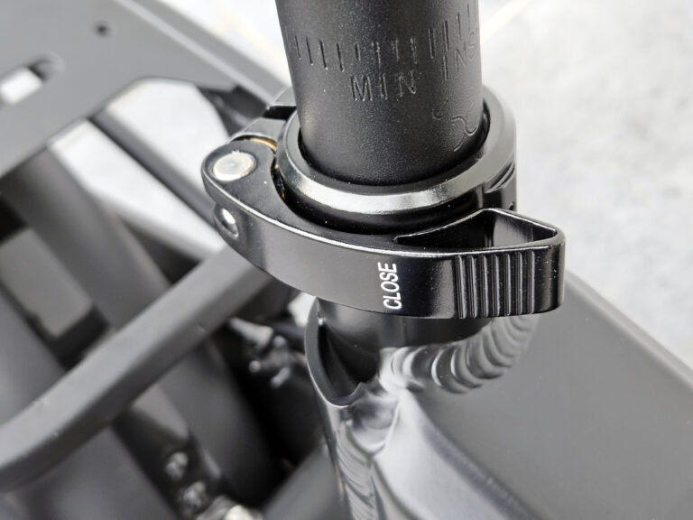 La selle se monte très facilement, il suffit d'ouvrir le verrou au niveau du tube, insérer la selle et ensuite resserrer le verrou. Il y a un indicateur "min" pour indiquer jusqu'au vous devez insérer la selle au minimum. Je ne peux malheureusement pas respecter cette indication car avec ma taille je suis obligé de dépasser la limite minimale de quelques centimètres sans quoi j'ai les jambes complètement pliées. Je reviendrais sur ce point plus tard dans le test car pour les personnes de grande taille, cela pourrait poser un problème.