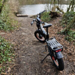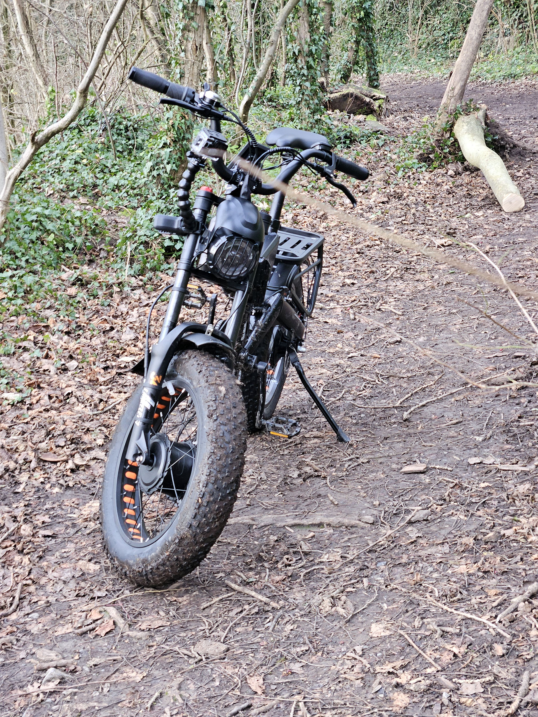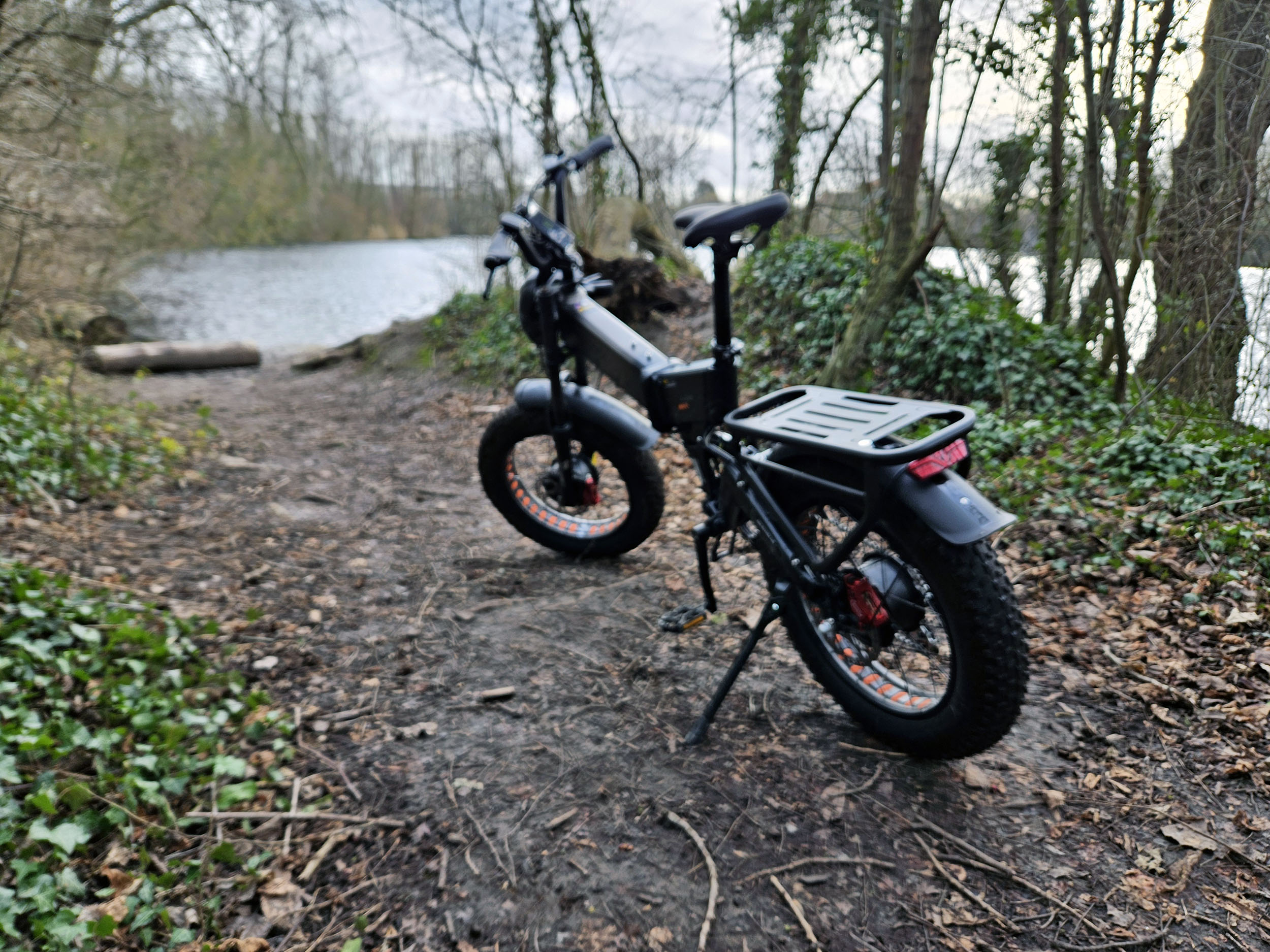 Je me suis aventuré dans un bois près de chez moi où des sentiers ont été aménagés pour pouvoir rouler en vélo, ces sentiers sont assez variés avec des montées et descentes assez importantes. Je me suis lancé sur le premier sentier avec une bonne dose de prudence car je n'avais jamais fait ça et après 100 mètres j'ai déjà dû m'arrêter car quelqu'un se promenait avec ses chiens, j'ai dû rapidement me mettre sur le côté. Le freinage est vraiment puissant même dans de mauvaises conditions mais j'ai bien senti que le sol humide allait rapidement devenir un problème.