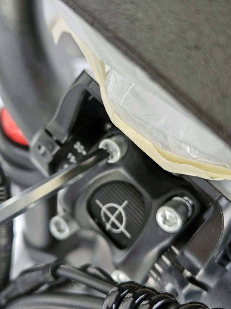 Le guidon est attaché au vélo par le câblage mais il faut le fixer sur la fourche. Il faut d'abord dévisser le support qui est tenu par 4 vis à dévisser avec une des clés allen livrées avec le vélo.