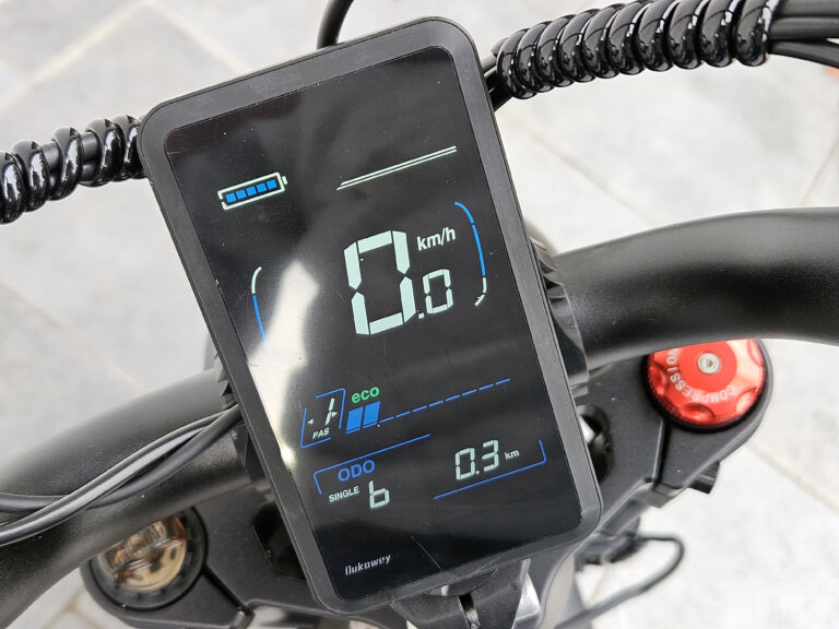 Sur la partie de gauche du guidon, il y a un panneau de contrôle qui permet d'allumer le vélo, changer le niveau d'assistance ou allumer les phares. Au centre on retrouve l'écran sur lequel on retrouve la vitesse, le niveau de batterie, le niveau d'assistance, la vitesse active et la distance parcourue. L'écran est inclinable pour réduire les reflets. Cet écran est un écran Dukawey, j'imagine qu'une partie des composants sont partagés sur plusieurs marques de vélo.