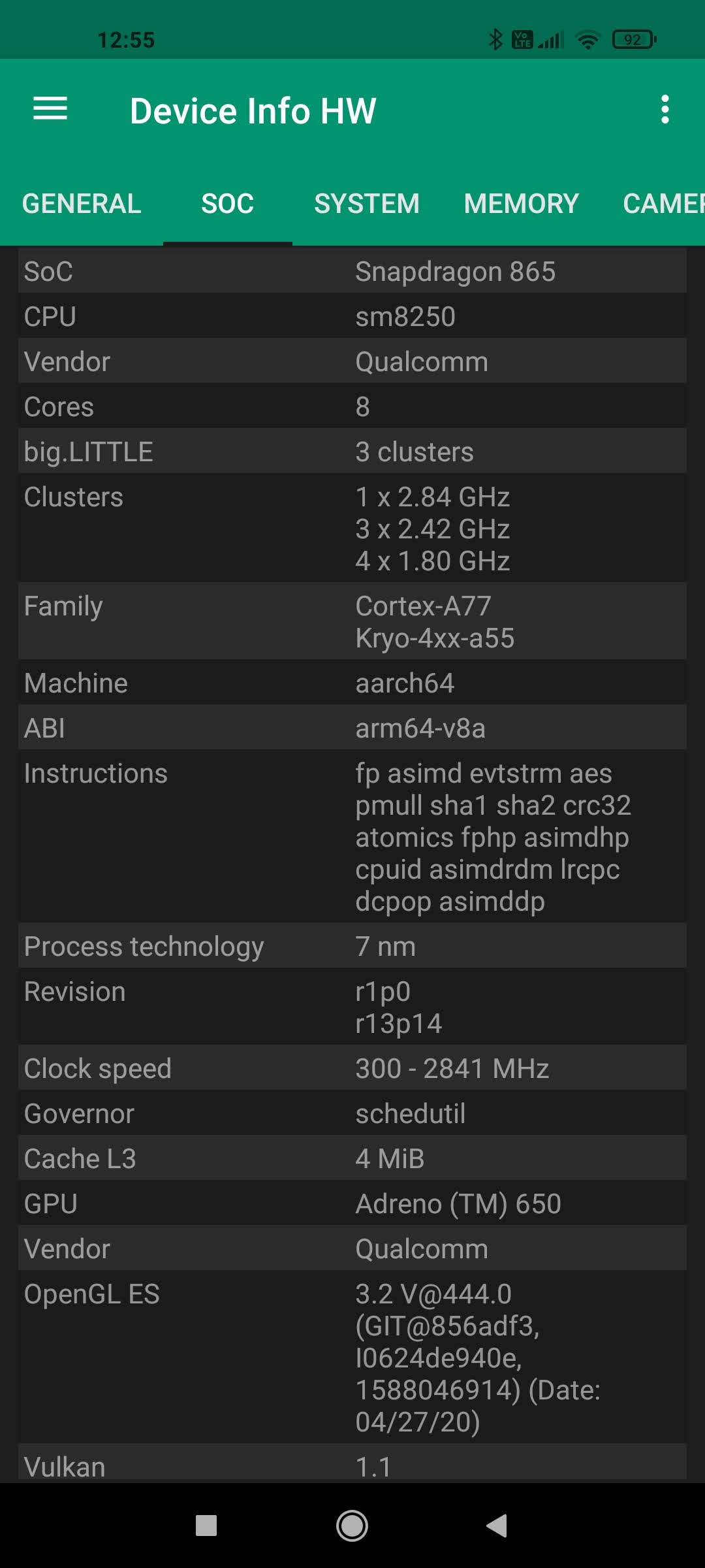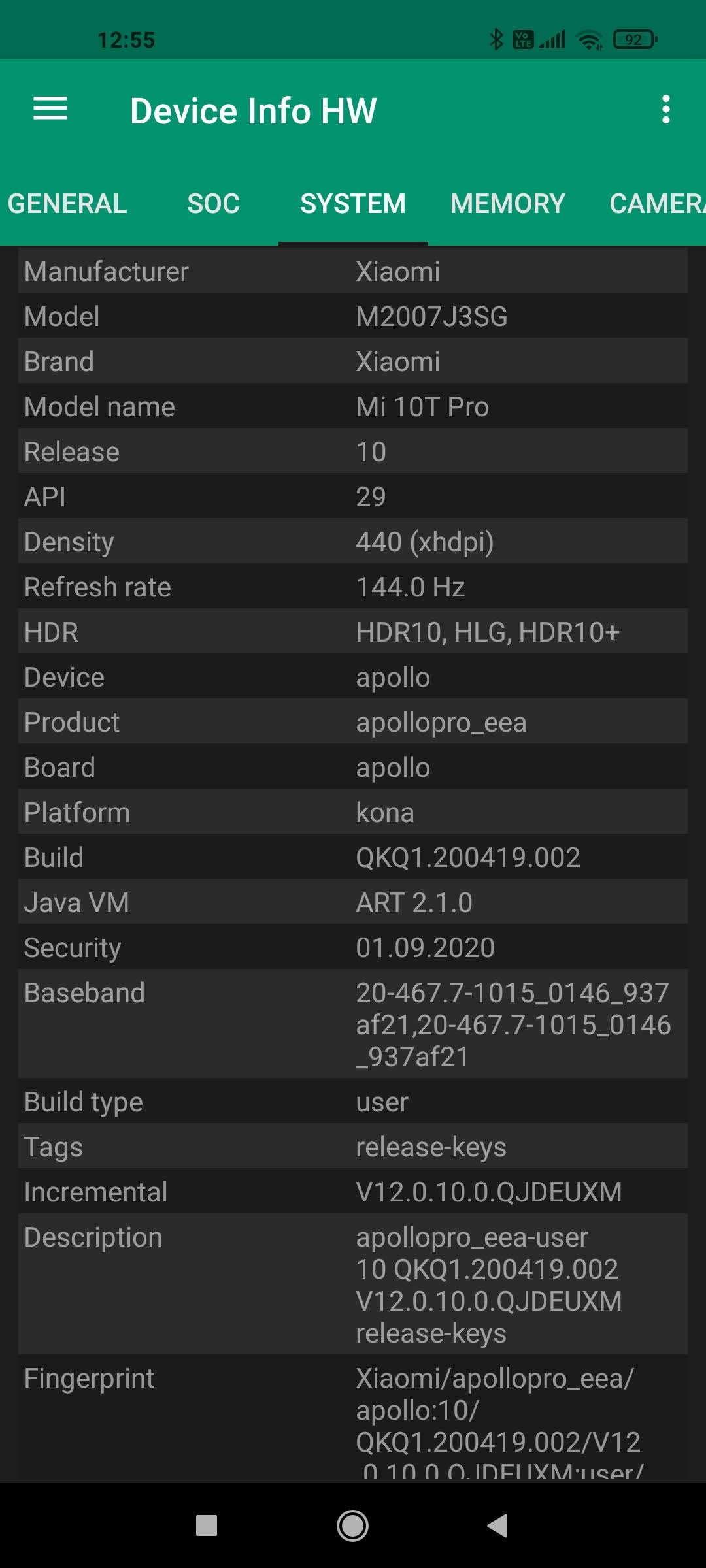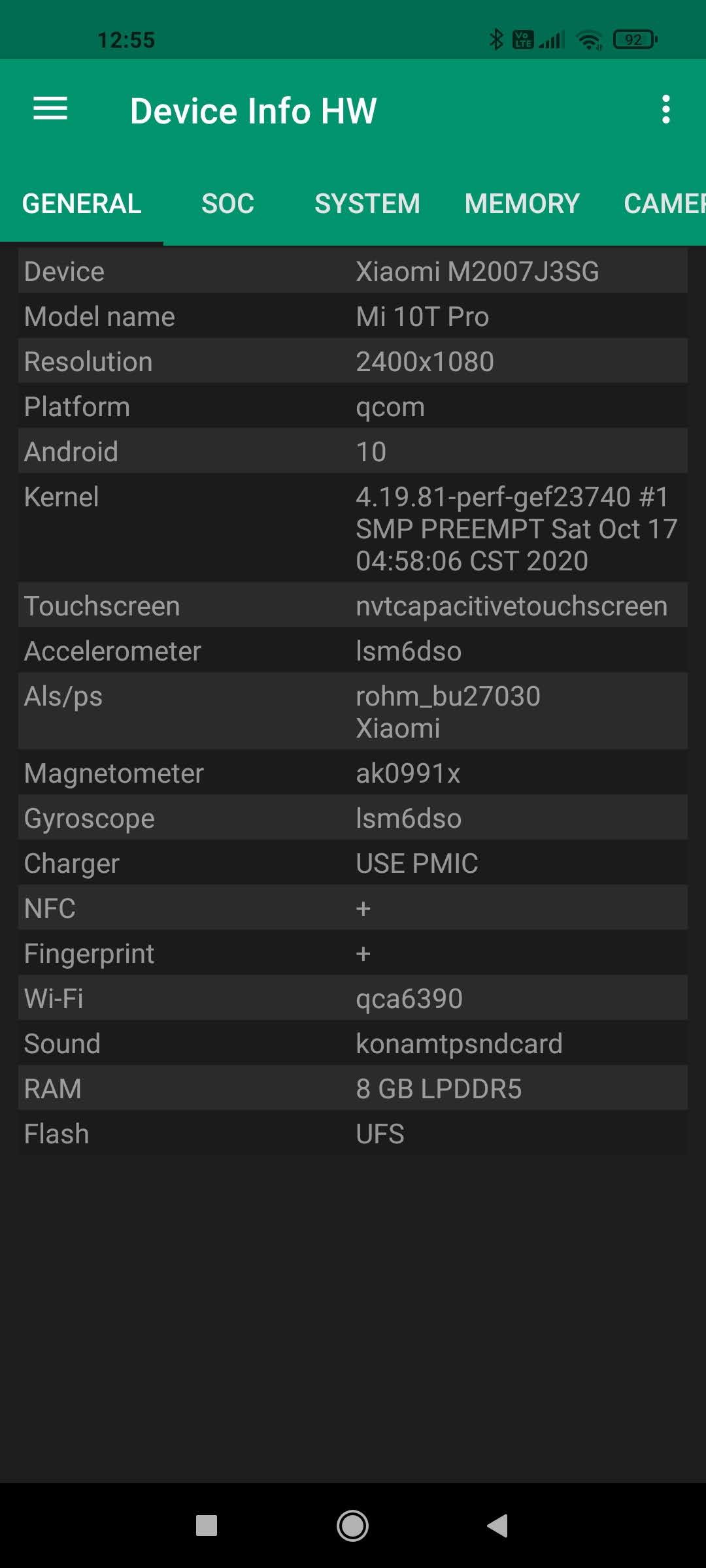 Les informations ci-dessous proviennent de l'application Device Info HW. L'application fournit des informations techniques détaillées sur le téléphone testé.J'ai acheté le Xiaomi Mi 10T Pro dans sa version 8Gb / 256 Gb, vous retrouverez les caractéristiques principales dans les écrans suivants.