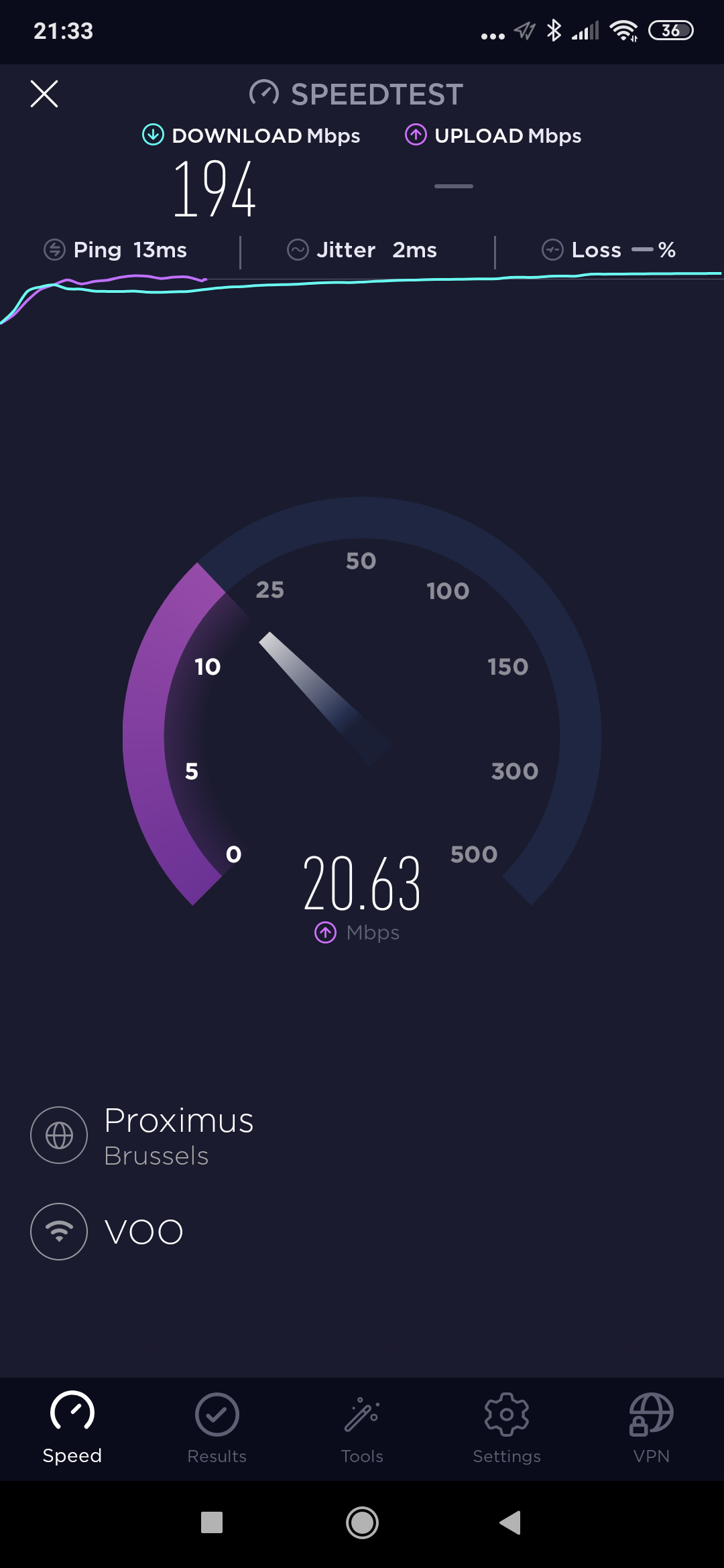 Pour tester la vitesse en Wifi, je me connecte à mon routeur en 2.4Ghz et 5Ghz (si disponible) et j'utilise l'application de Ookla pour mesurer la vitesse.