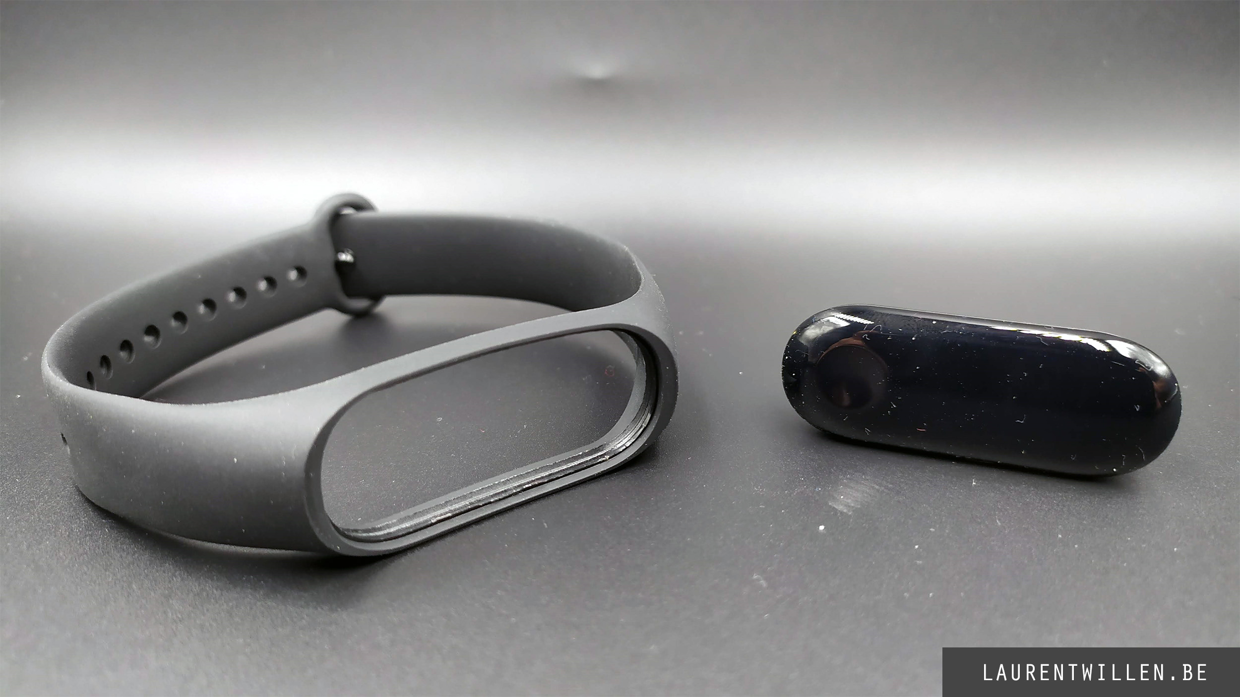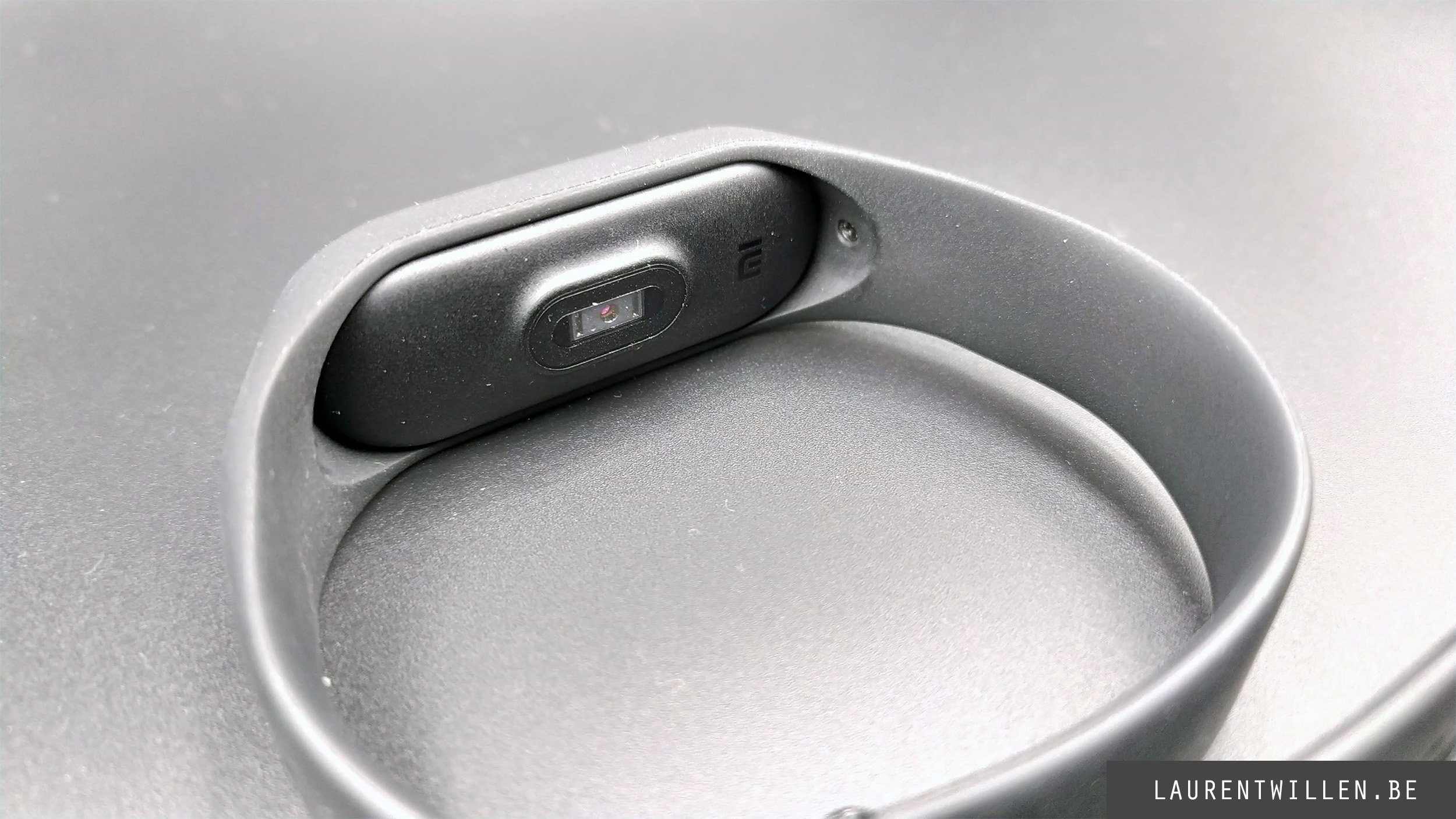 Le Mi Band dispose d'un écran noir et blanc tactile en façade avec un bouton de controle. On l'allume par le bouton et on fait glisser les menus sur l'écran tactile. A l'arrière, on retrouve un capteur de fréquence cardiaque.