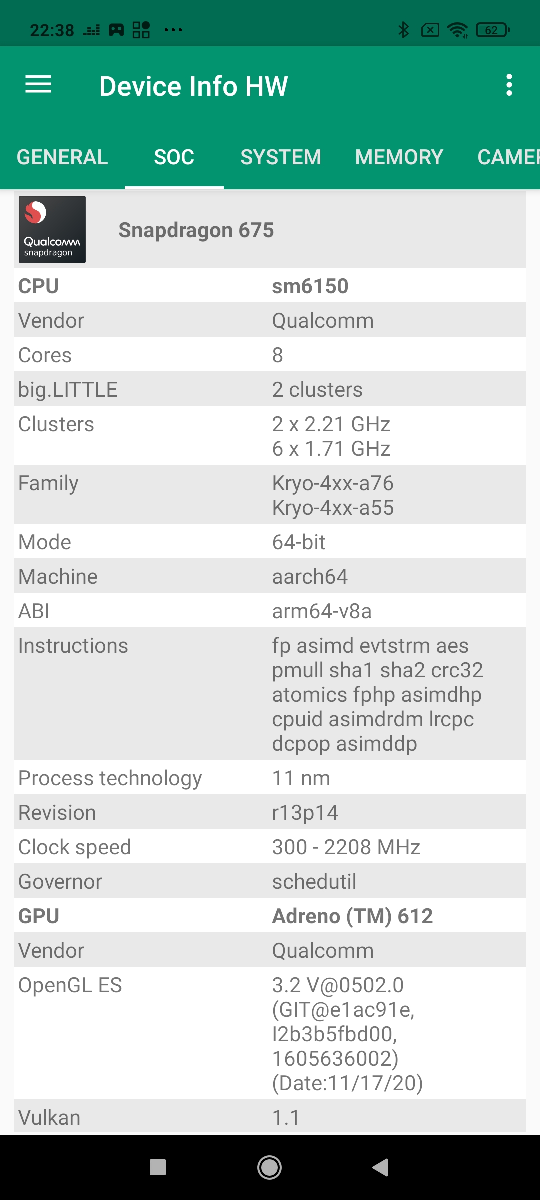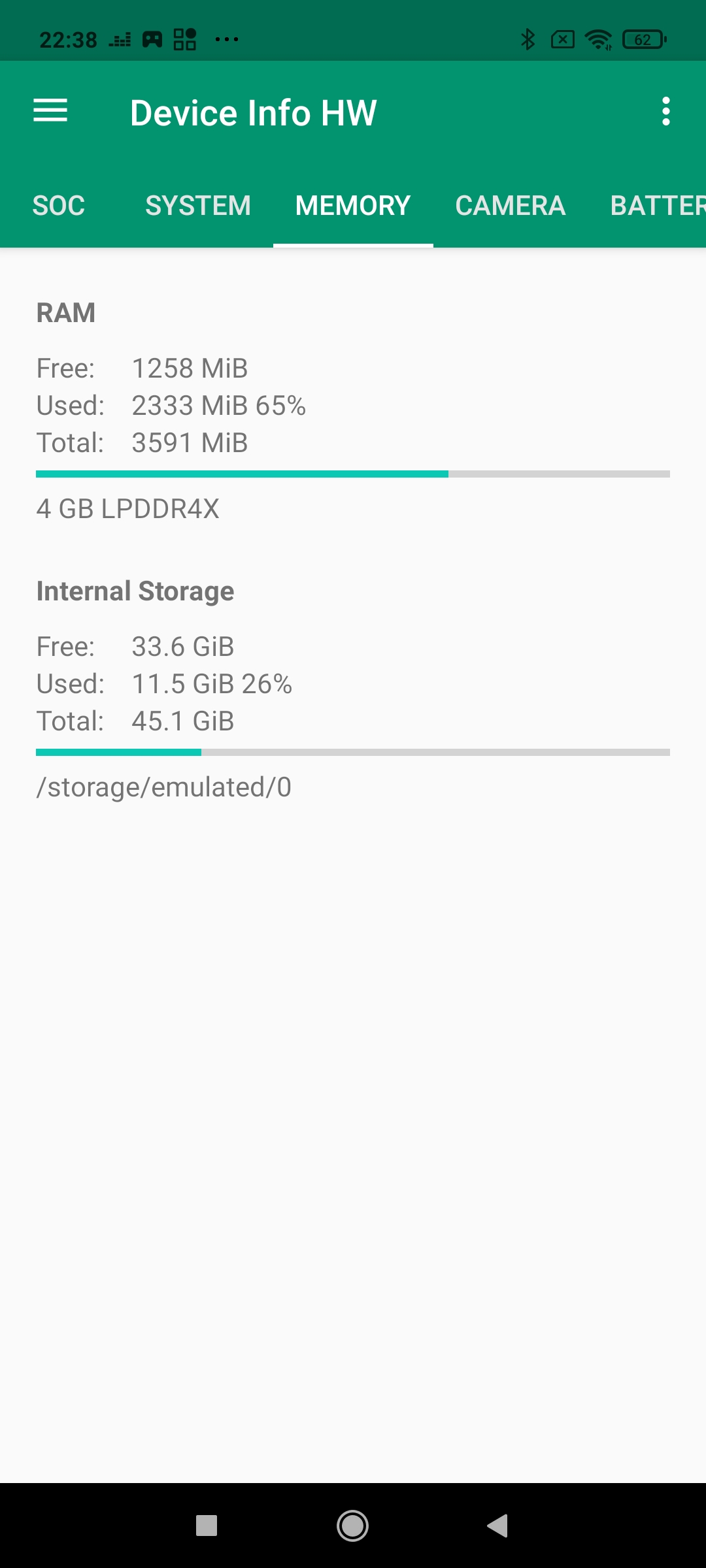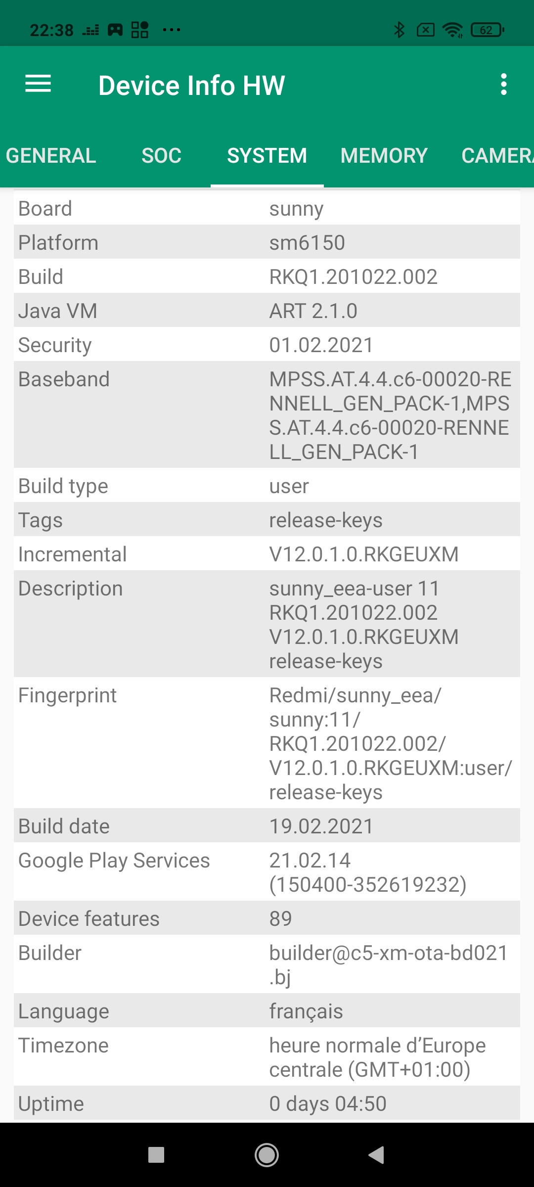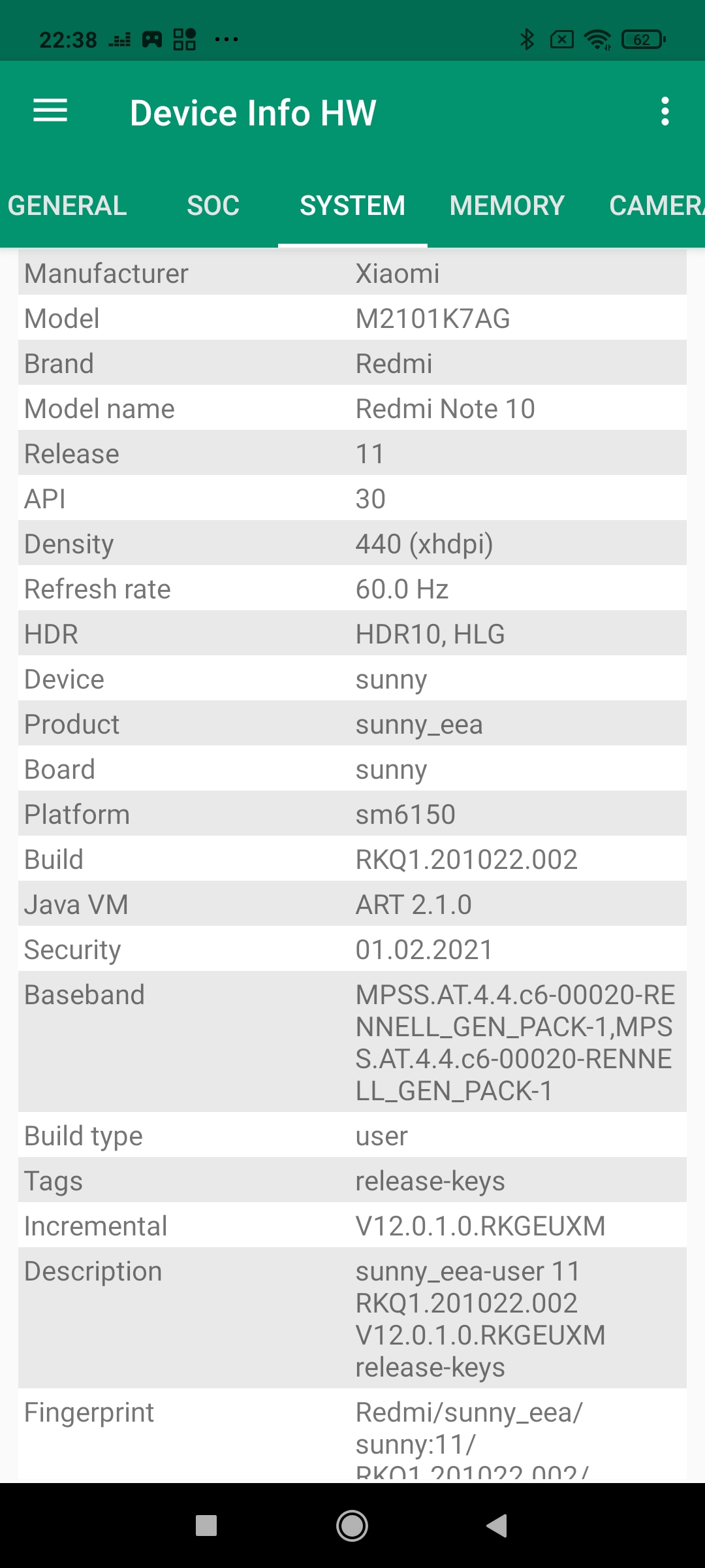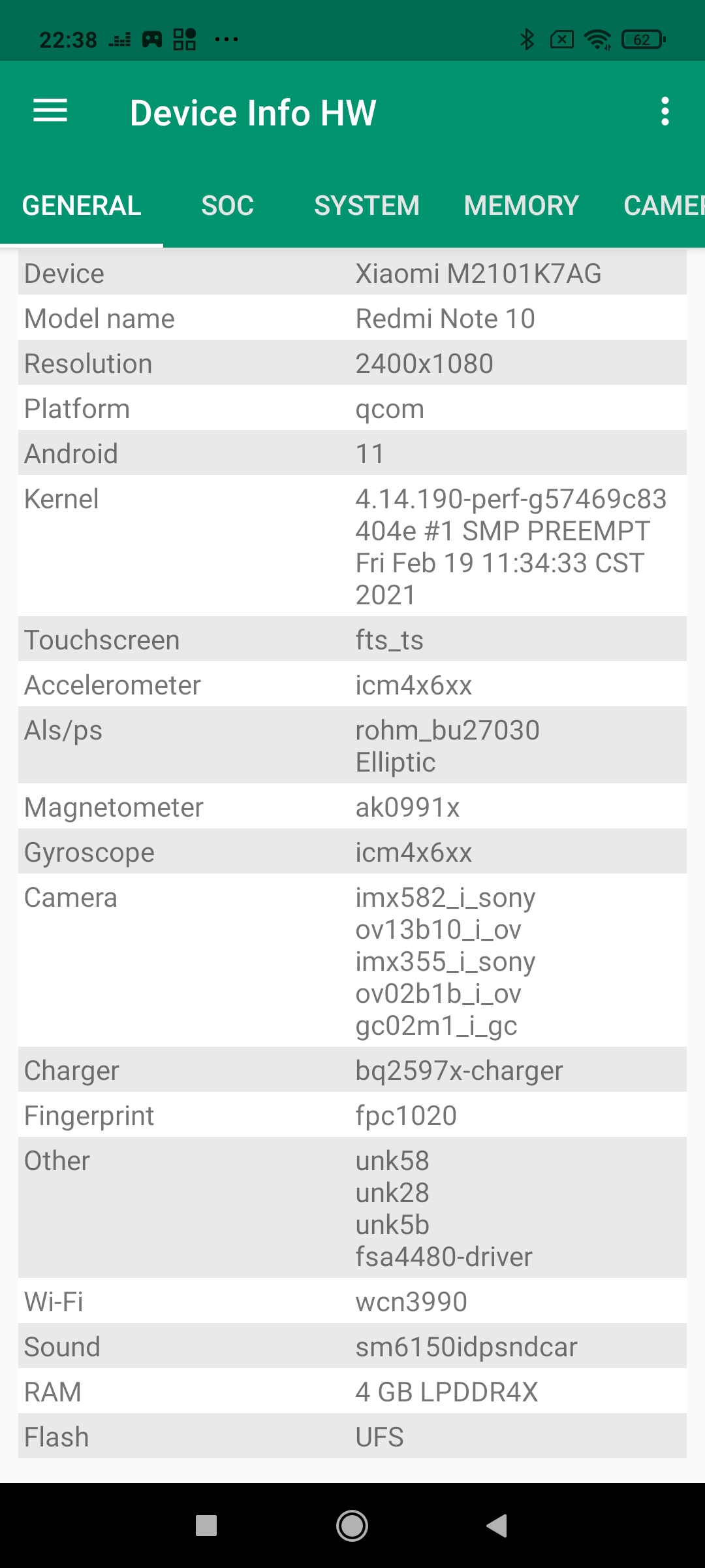 Les informations ci-dessous proviennent de l'application Device Info HW. L'application fournit des informations techniques détaillées sur le téléphone testé.J'ai acheté le Redmi Note 10 dans sa version 4 GB / 64 Gb (couleur Onyx Grey).