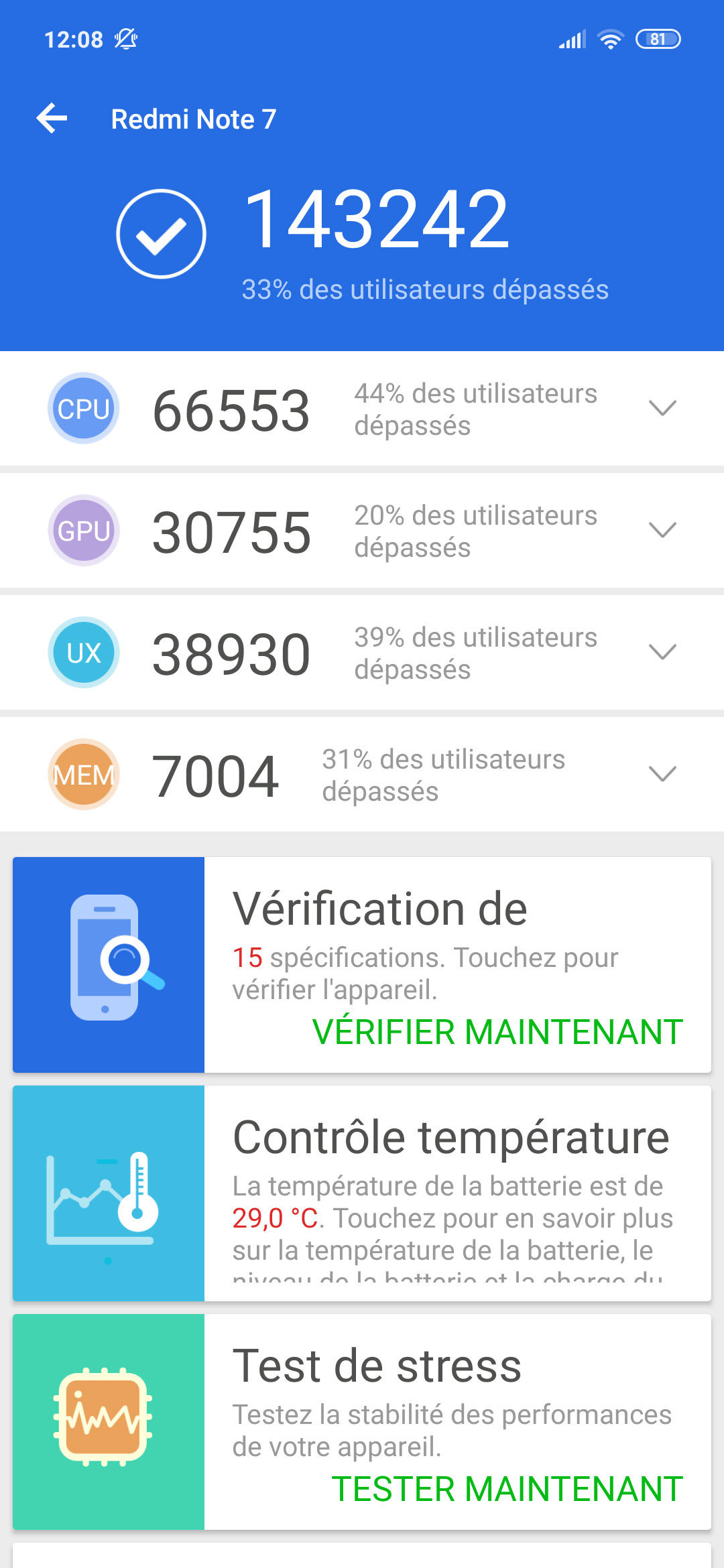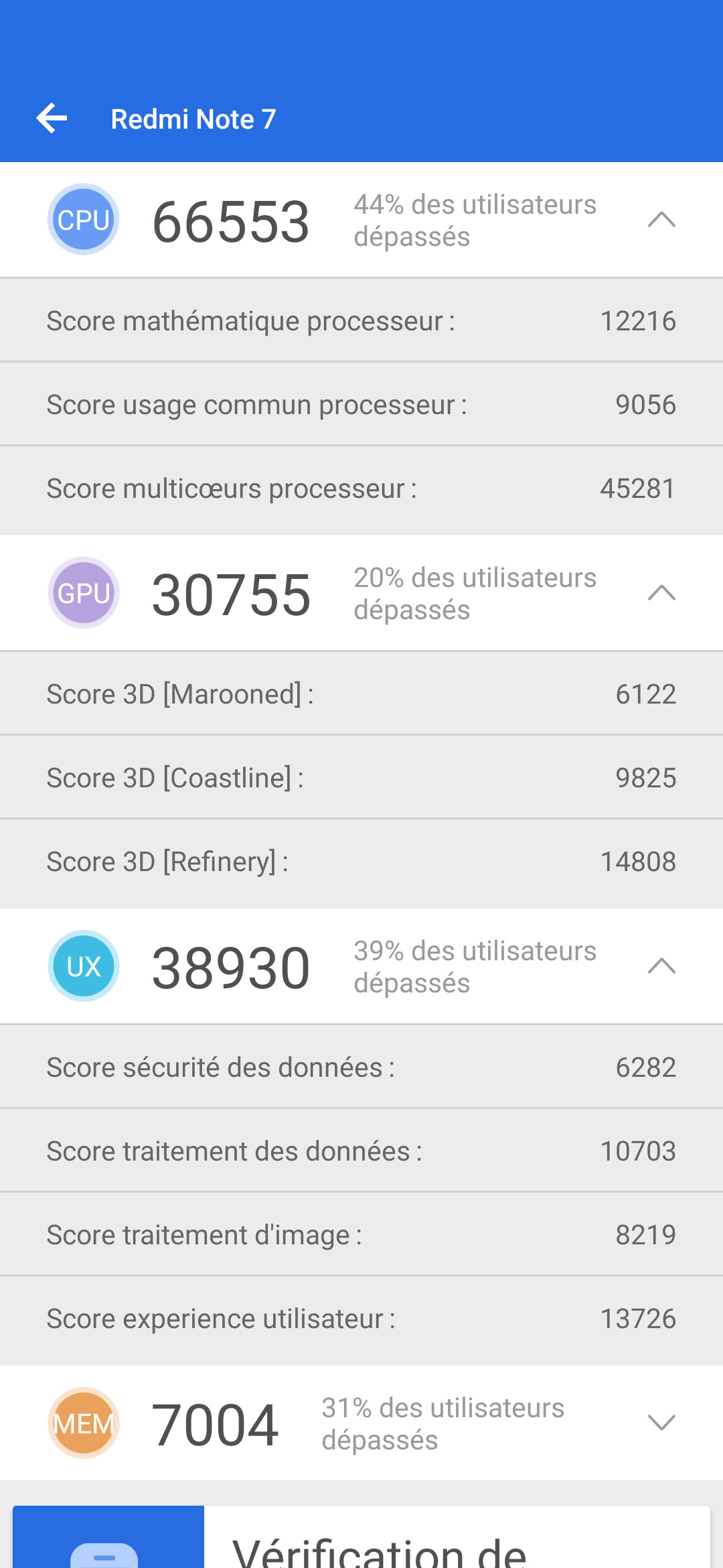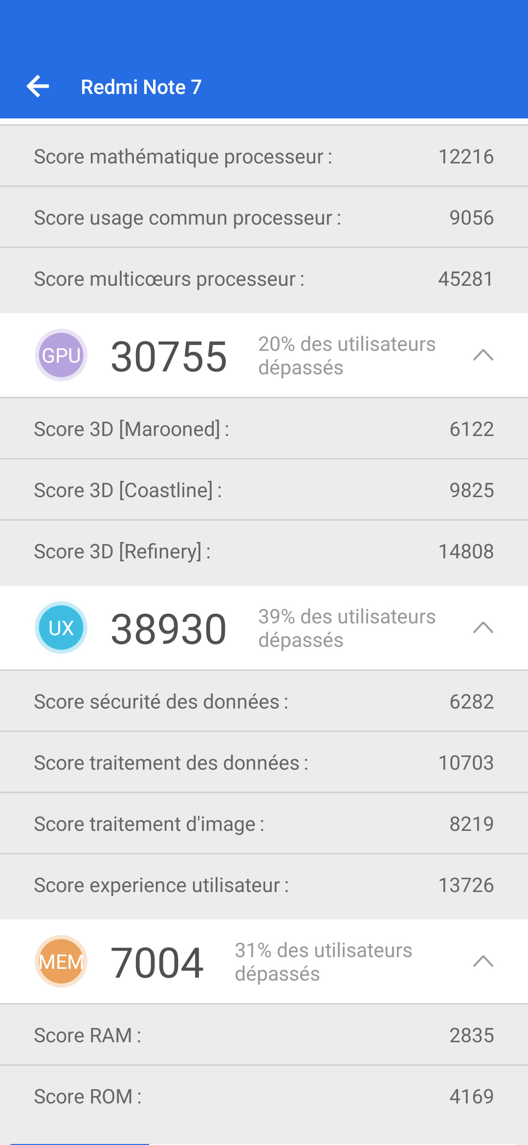 Le Redmi Note 7 obtient un score Antutu de 143242 points ce qui le positionne au niveau du Xiaomi Mi 8 Lite pour un prix bien inférieur. Au niveau CPU, le Honor 8x fait un peu mieux mais il est nettement plus cher. Au niveau GPU, le Umidigi F1 fait mieux pour un prix plus ou moins équivalent.