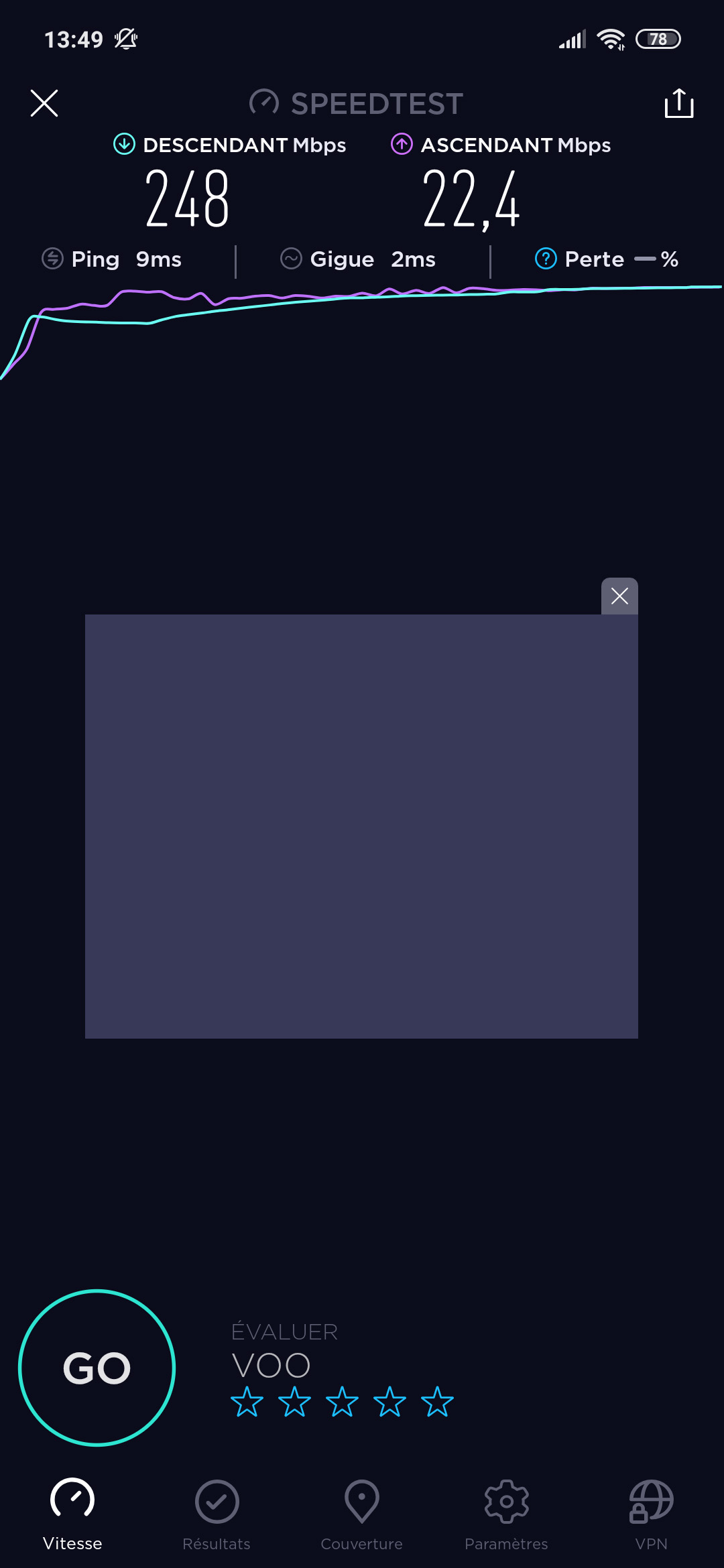 Le Redmi Note 7 est capable de capter la fréquence 5Ghz en WIFI ce qui lui permet d'atteindre des débits assez importants. Après quelques tests à proximité du router et à distance, j'ai mesuré une bonne vitesse de téléchargement aux alentours des 250Mbps avec une vitesse en upload limitée par mon fournisseur 21-22Mbps. Le Redmi Note 5 reste cependant l'appareil le plus rapide que j'ai pu tester avec des pointes à 280Mbps que je n'ai pas réussi à reproduire avec un autre appareil.