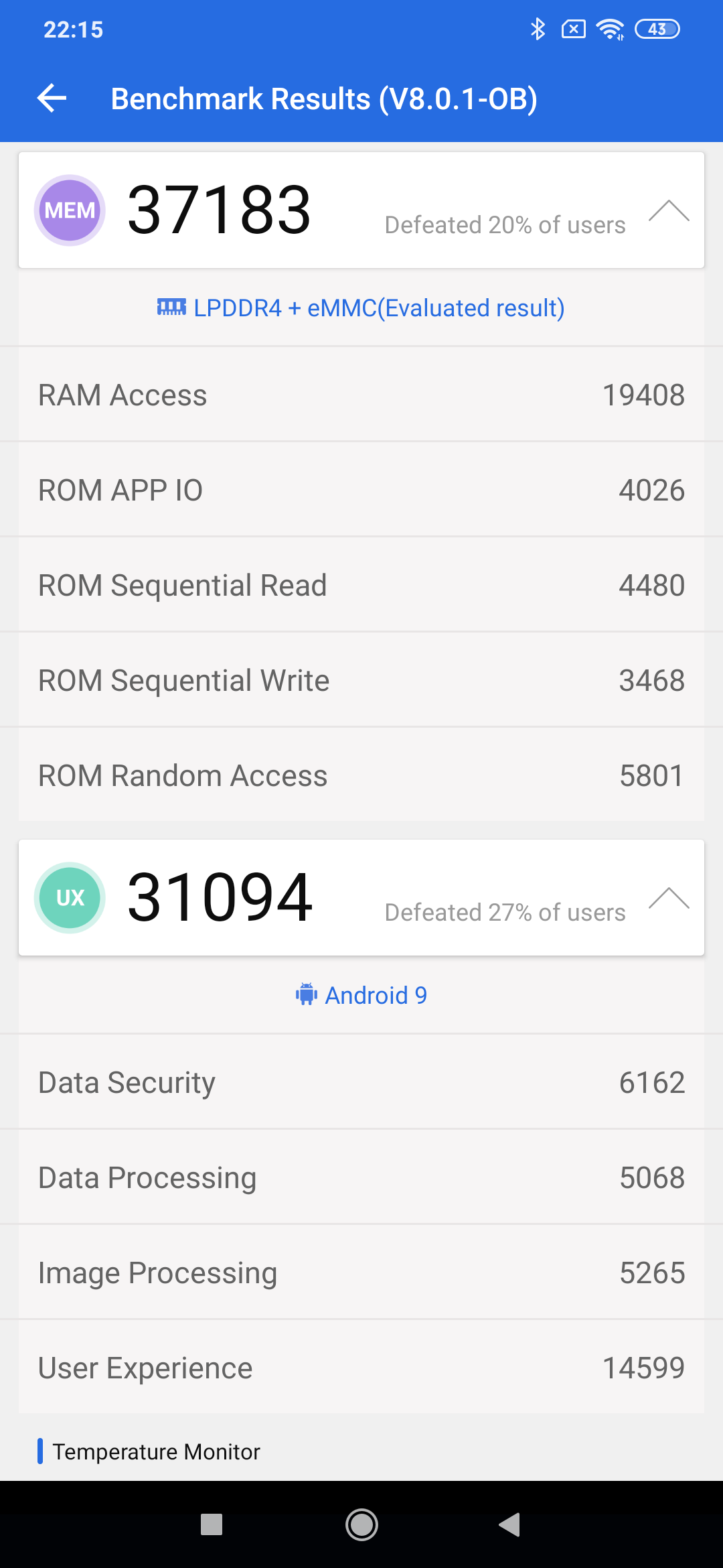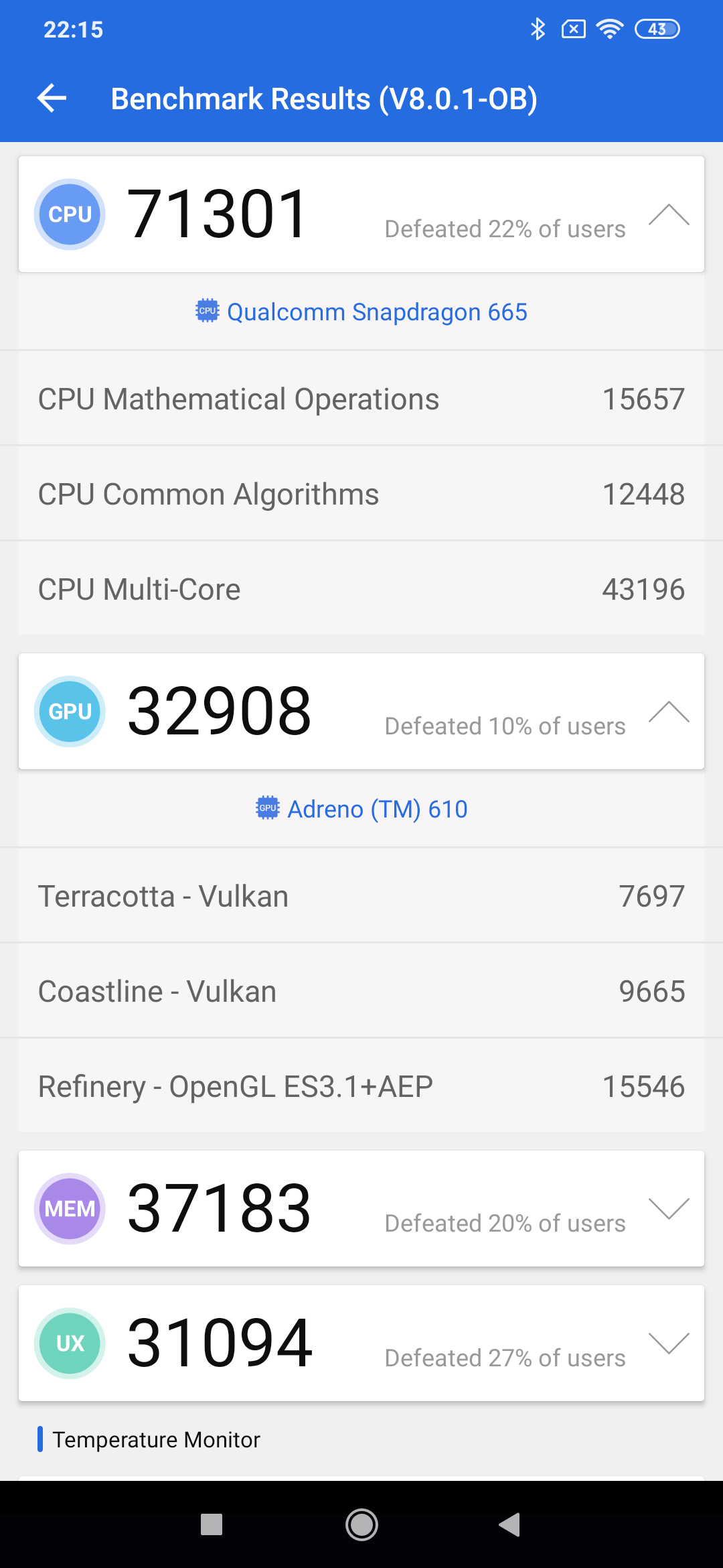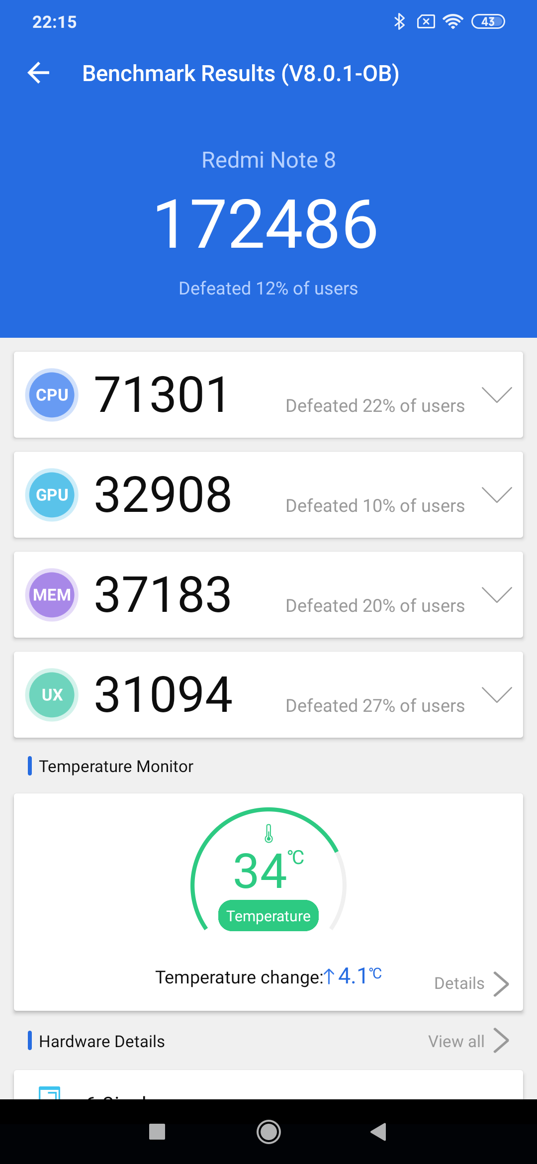 Le Redmi Note 8 utilise la même configuration que le Xiaomi Mi A3, ils utilisent tous les deux un CPU Snapdragon 665 and et un GPU Adreno 610. Sur le Xiaomi Mi A3, j'ai obtenu de bonnes performances en jeu malgré un score Antutu dans la moyenne. Cette performance s'explique par l'utilisation d'une résolution plus faible et donc moins gourmande. Le Redmi Note 8 utilise une résolution plus élevée que le Xiaomi Mi A3, il devrait donc offrir une performance inférieure dans les jeux car son GPU doivent fournir des images dans une résolution plus élevée.