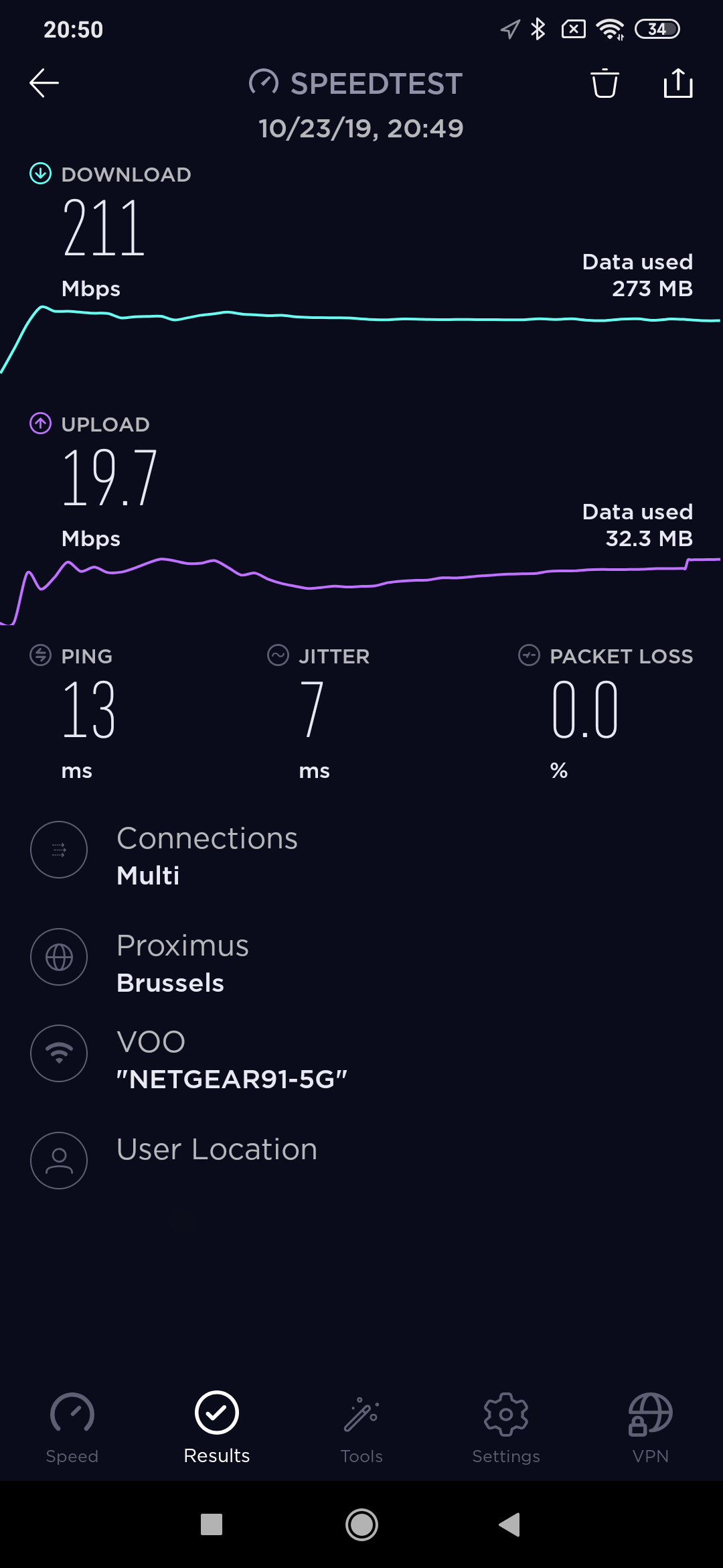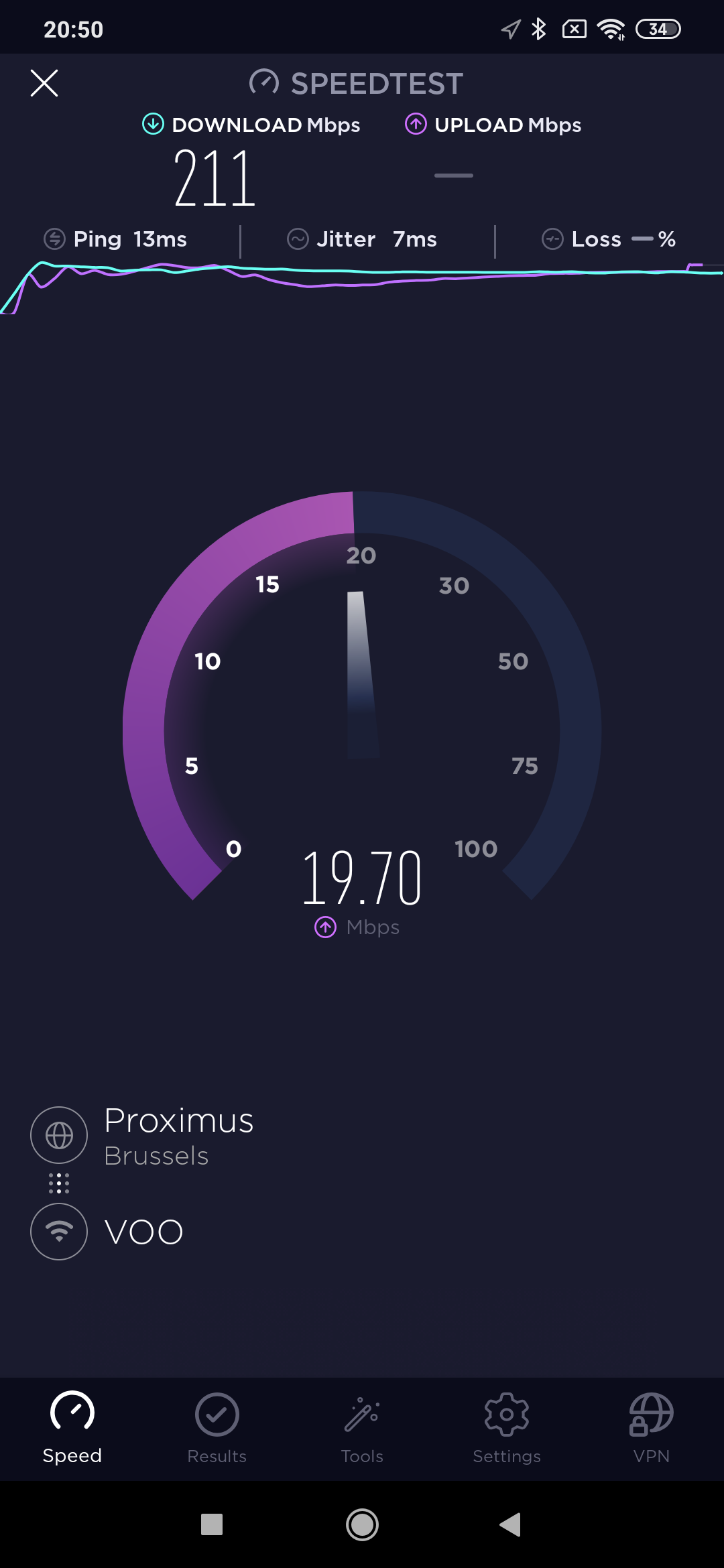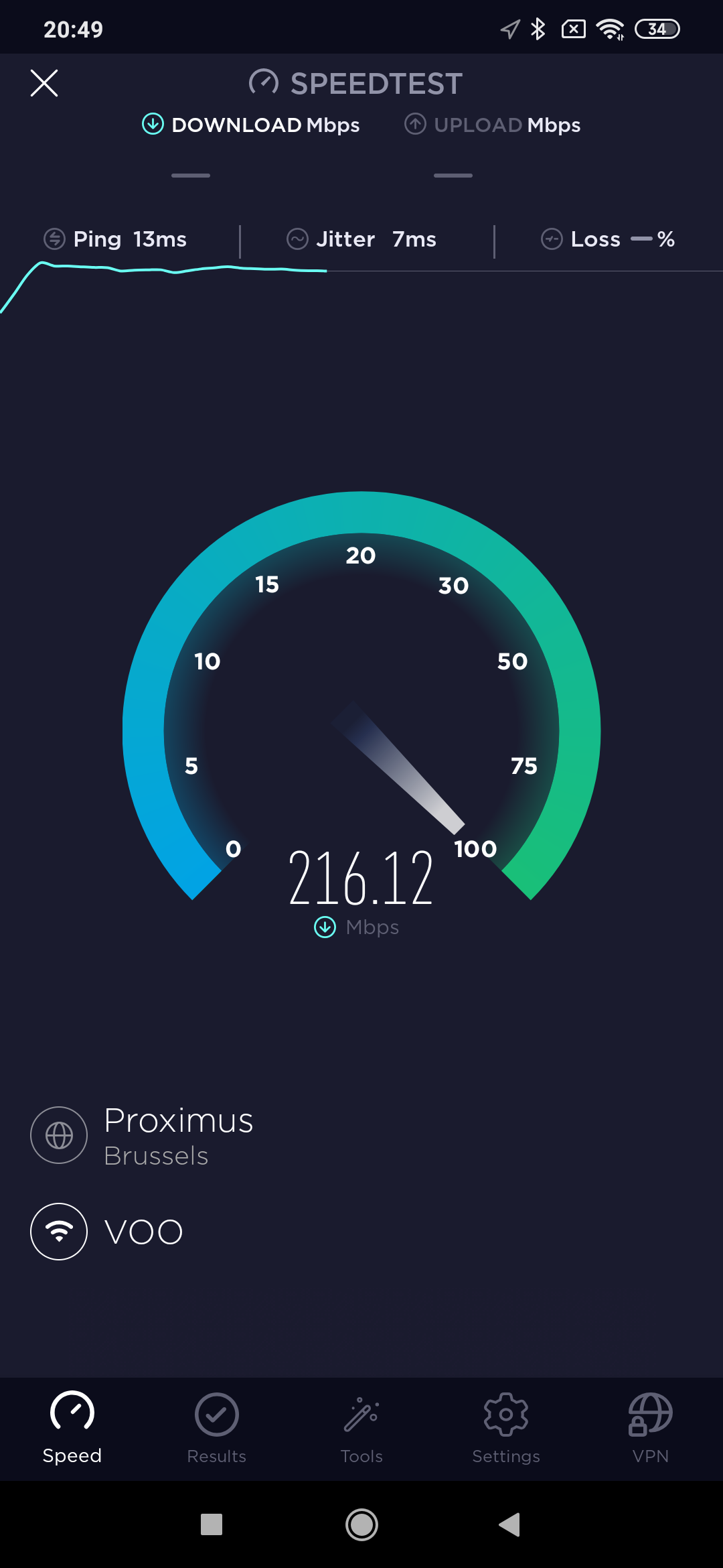 Pour tester la vitesse en Wifi, je me connecte à mon routeur en 2.4Ghz et 5Ghz (si disponible) et j'utilise l'application de Ookla pour mesurer la vitesse.La bonne performance du signal wifi se traduit par une bonne performance au niveau de la vitesse de téléchargement. Avec plus de 200 Mbps, vous pourrez sans problème faire du streaming ou télécharger des fichiers. Le Redmi Note 8 est nettement moins rapide que la version Pro (Plus de 350 Mbps) mais à ce niveau de performance, la grande majorité des utilisateurs ne verront aucune différence.