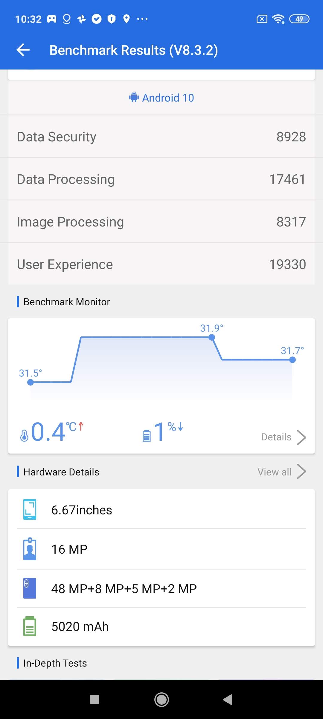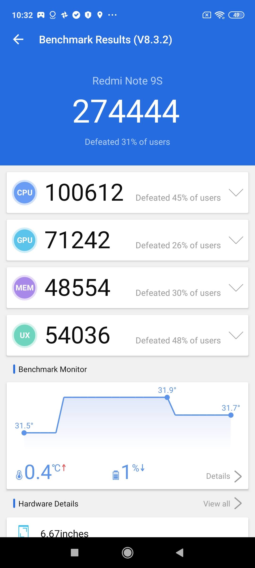 J'ai obtenu un score de 274444 points avec Antutu v8, ce score le classe de nouveau au même niveau que le Realme 6 et le Redmi Note 8 Pro mais si on regarde dans le détail je note quand même quelques différences.Le score au niveau processeur (Snapdragon 720G) est surprenant, il dépasse le Realme 6 ainsi que le Redmi Note 8 pour un prix inférieur.