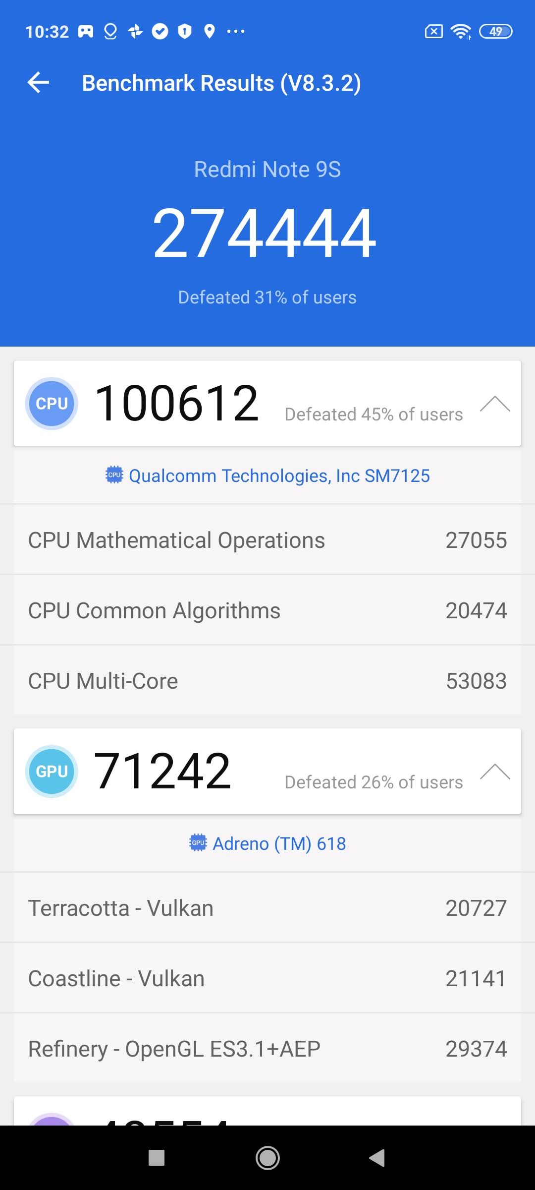 Pour le GPU, le Redmi Note 9s est équipé d'un Adreno 618 qui de nouveau devrait le classer entre le Xiaomi Mi 9 Lite et le Redmi Note 8 Pro et ici aussi, il les dépasse tous.