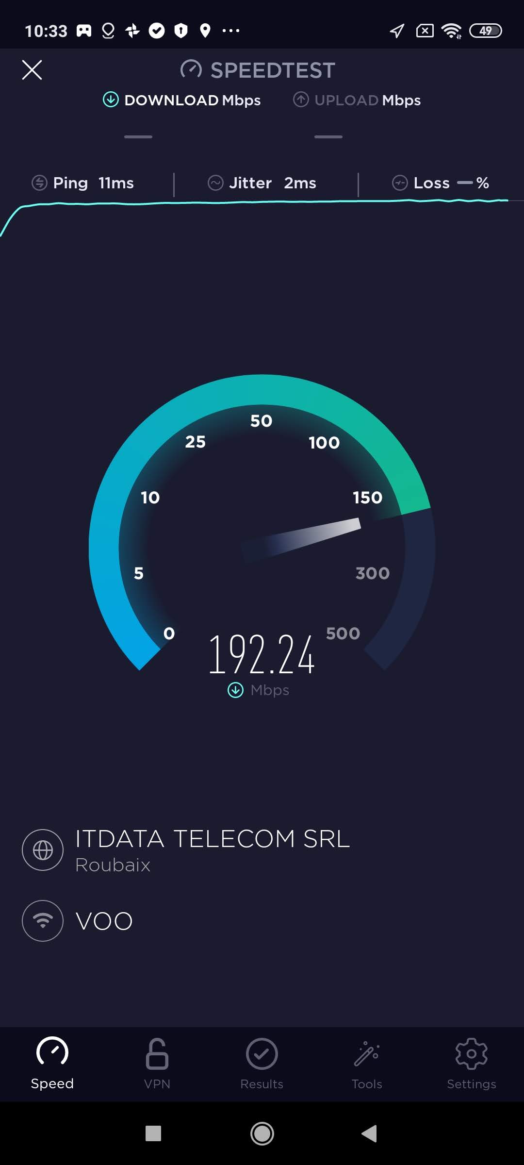 Pour tester la vitesse en Wifi, je me connecte à mon routeur en 2.4Ghz et 5Ghz (si disponible) et j'utilise l'application de Ookla pour mesurer la vitesse.J'ai mesuré une vitesse de téléchargement en wifi de presque 200 Mbps. Avec ce genre de vitesse, vous pourrez faire du streaming en 1080p ou jouer en ligne sans aucun problème.