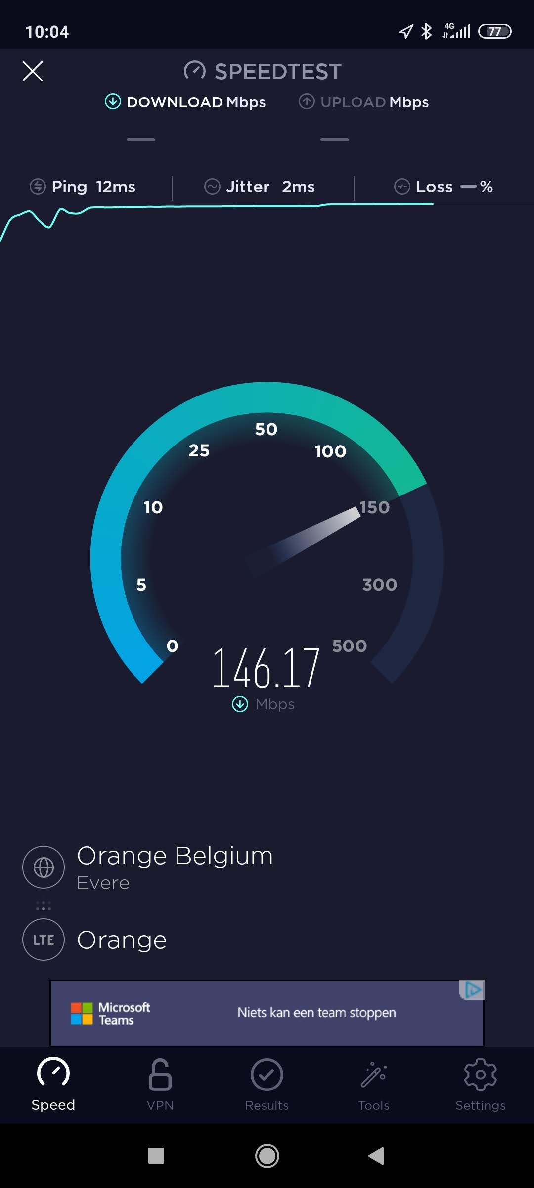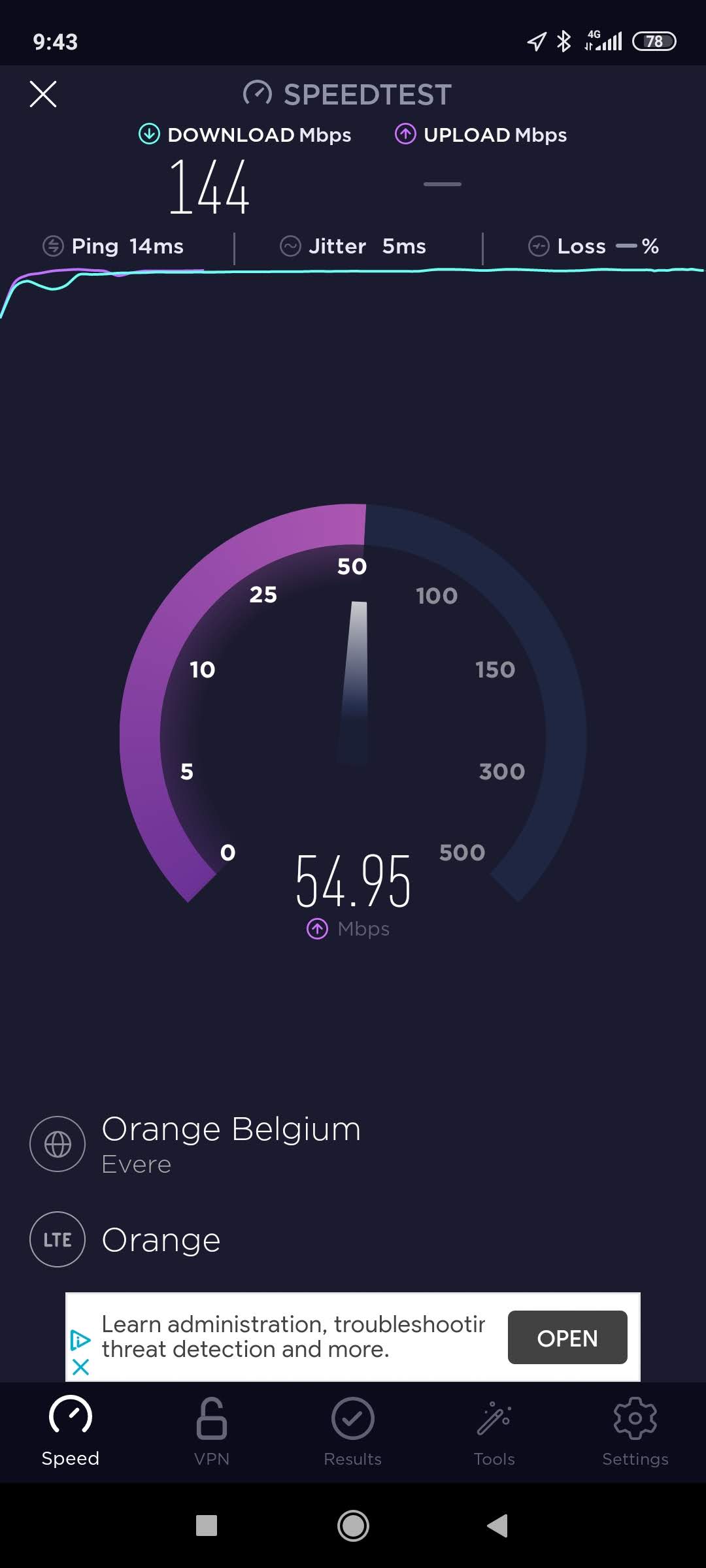 J'ai obtenu un bon score de vitesse en 4G avec le Redmi Note 9s. En download j'ai obtenu une vitesse de presque 150 Mbps et en upload j'ai presque obtenu 60 Mbps. Vu que ces valeurs semble rester coincées autour de 150 et 60, il s'agit probablement du maximum toléré par le réseau ou la vitesse maximale du téléphone.