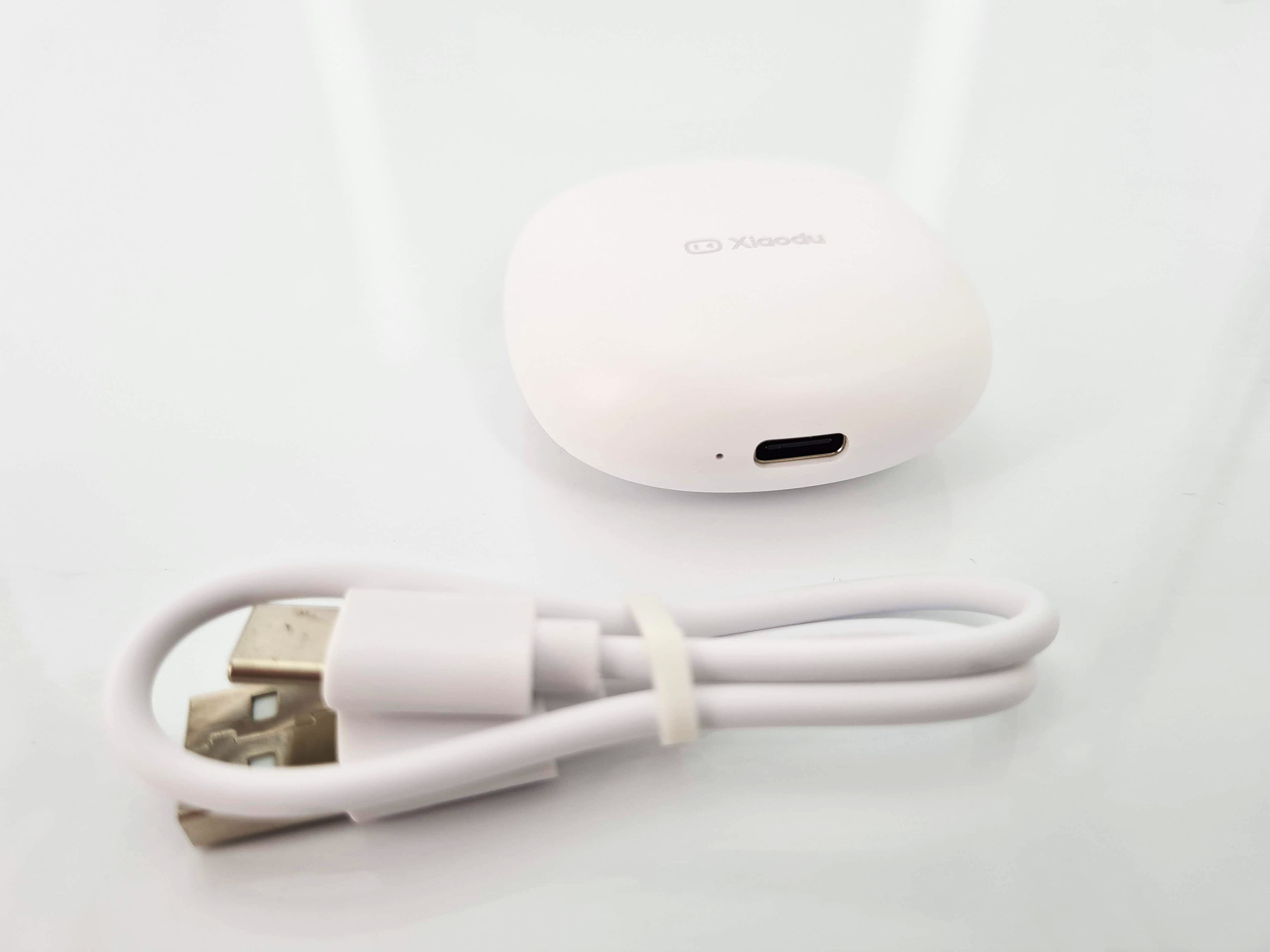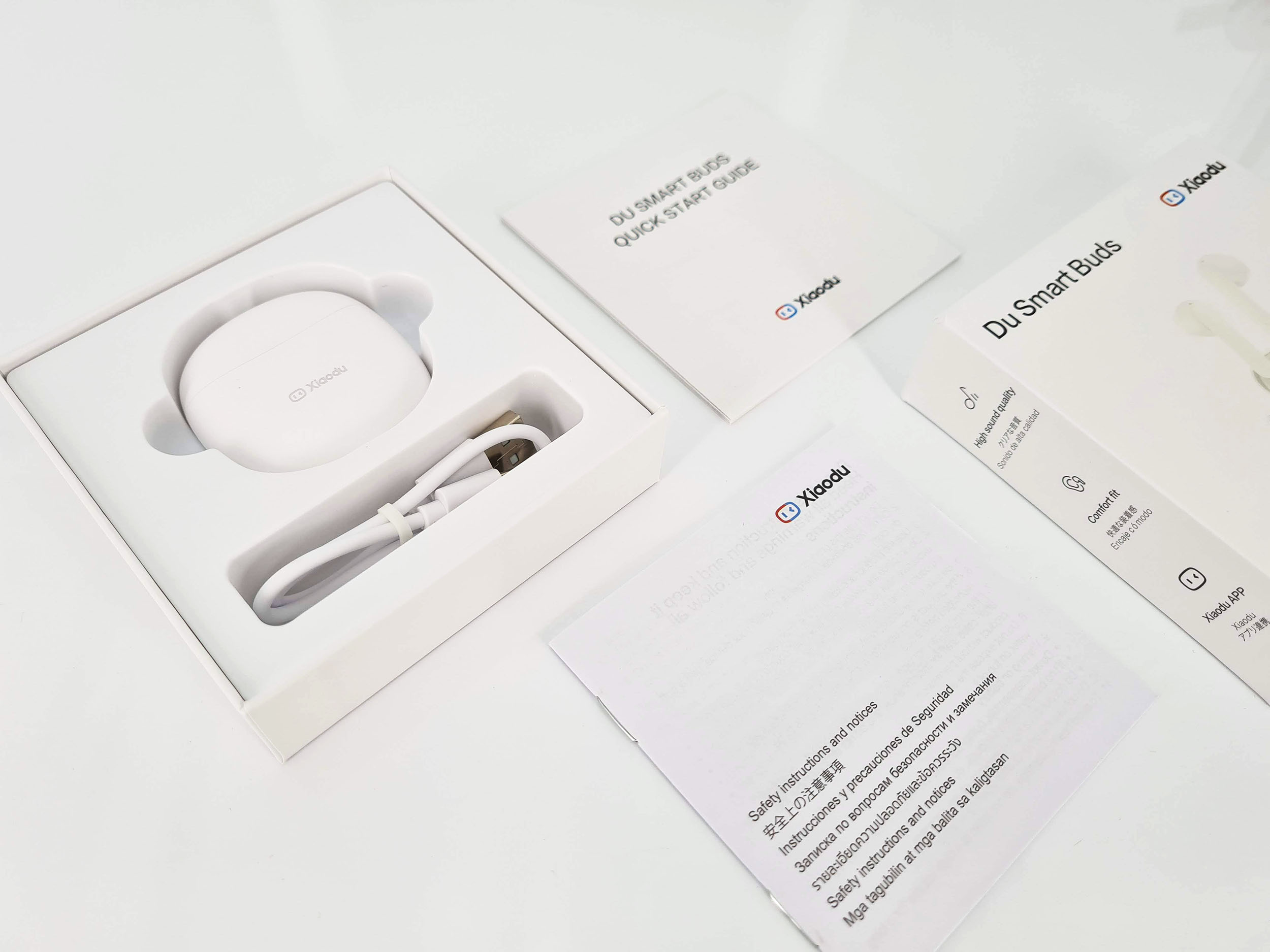 La scatola di Xiaodu Smart Buds contiene una custodia che permette anche di caricare gli auricolari, un cavo USB e un manuale in diverse lingue.